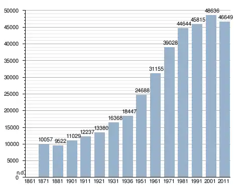في سنة 1871 بلغ عدد السكان 10٬057 نسمة، وتطور العدد ليصل في سنة 2011 لـ 46٬649 نسمة.