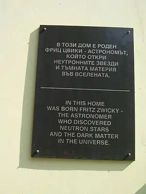 فريتز زفيكي (بالألمانية: Fritz Zwicky) في الفيزياء والفلك عالم الفيزياء والفلك السويسري ، ولد في مدينة وارنا في بلغاريا وكان أبوه تاجر قطن سويسري يعمل هناك، ولد في 14 فبراير 1898 وتوفي في باسادينا، كاليفورنيا في 8 فبراير 1974 . عمل بصفة رئيسية في معهد كاليفورنيا للتكنولوجيا Caltech . من أهم أعماله العلمية بحوثه في النجوم النيوترونية والمادة المظلمة التي فكر فيها عن دراسته للمجرات وسرعة دورانها حول نفسها .[7]
