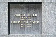 فريدريش أدلر (بالألمانية: Friedrich Adler ) (و. 1879 – 1960)[11] هو سياسي، وصحفي اشتراكي نمساوي، ولد في فيينا[12]، كان عضوًا في حزب النمسا الاجتماعي الديمقراطي، توفي في زيورخ[12]، عن عمر يناهز 81 عاماً، وهو ابن السياسي النمساوي فيكتور آدلر.[13]