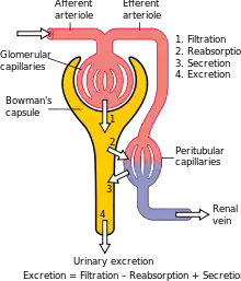 تدرس فيزيولوجيا الكلية على مستوى النفرون، وهو أصغر وحدة وظيفية في الكلى. كل نفرون يبدأ بتركيب يعمل على تشريح الدم الداخل إلى الكلى. يتدفق هذا الرشح بعد ذلك بطول نفرون، وهو هيكل أنبوبي مبطن بطبقة واحدة من الخلايا المتخصصة المحاطة بالشعيرات الدموية. المهام الرئيسية لهذه الخلايا المبطنة هي إعادة امتصاص الماء والجزيئات الصغيرة من الرشح إلى الدم، وإفراز النفايات من الدم إلى البول.