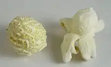 على اليسار حبة ذرة قبل أن تصبح فشار، وعلى اليمين حبة فشار جاهزة.