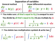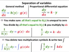 إذا كان بإمكان المرء إيجاد حلول التكاملات ، فيمكنه إيجاد حل للمعادلة التفاضلية. لاحظ أن هذه العملية تسمح لنا بمعاملة المشتق بشكل فعال ككسر يمكن فصله. يتيح لنا ذلك حل المعادلات التفاضلية القابلة للفصل بسهولة أكبر ، كما هو موضح في المثال أدناه.