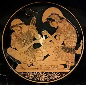 يستأذن باتروكلوس من حبيبه و قائده أخيل في اعادة الاشتراك في حرب طرواده مع جنده (بعدما توقف أخيلوس عن المشاركة)، فيأذن له أخيل و يلبسه درعه و سلاحه فظن الطرواديين انه اخيل نفسه و قد سبب لهم بذلك الفعل خسائر، غير أنه يقتل على يد هكتور فيندم أخيل على استسلامه لغضبه، ويفكر في الانتقام له، و في حالة من الغضب العارم يعود للمشاركة في الحرب للانتقام من هكتور قاتل فطرقل ، فيقتل هكتور ويقوم بسحب جثته بحبل مربوط بعربته في جميع انحاء طروادة، و بعد عودته إلى المخيم العسكري يأتي اليه ملك طروادة بريام ويرجوا منه أن يسلمه جثة هكتور، وكانت قد بلغت الوحشية من أخيليوس أنه أراد رمي الجثة إلى الكلاب، ولكن سرعان مارق قلبه وسلم جثة هكتور إلى أبيه الهرم شفقةً به.