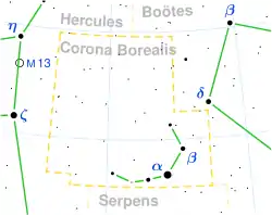 ![]() مكان نير الفكة في كوكبة الإكليل الشمالي (النقطة الحمراء) | |