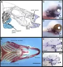 فكي الفم والبلعوم من البلطي. تُظهر الصور مقلّب ملاوي ( Dimidiochromis compressiceps).