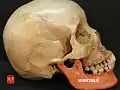 ![]() الجمجمة البشريّة، و يظهر عظم الفك السفلِيّ باللون الأرجواني أسفل الصورة. الجمجمة البشريّة، و يظهر عظم الفك السفلِيّ باللون الأرجواني أسفل الصورة. | |