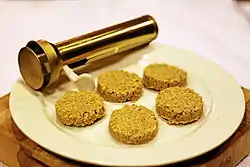 توضع المكونات السابقة في مدق أو مفرمة خشنة، وليس الكبة حتى تخرج خشنة الملمس نوعا ما وليست ناعمة للغاية ثم توضع عليها قليل من كربونات الصوديوم لتعطي انتفاخا للقرص.