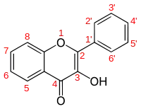 الهيكل البنائي للفلافونولات، مع الترقيم لتبيان أماكن المستبدلات.