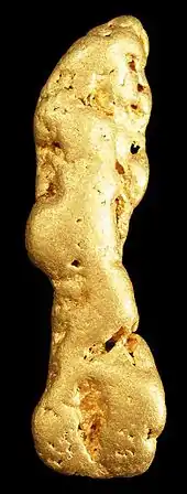 قطعة كبيرة من الذهب الخام وجدت في جبال كاسكوكويم، في وسط ألاسكا، في الولايات المتحدة. بأبعاد 6,6 × 2 × 1,1 سم، وتزن حوالي 77 غرام.
