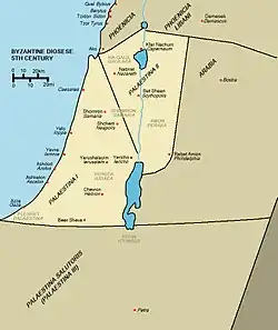 ![]() خريطة لمقاطعة فلسطين الثالثة (الصحيحة) ضمن الأبرشية المشرقية في القرن الخامس. | |||||||