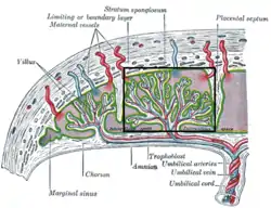 ![]() هيكل من المشيمة، مع الفلقات، ملحوظ في المستطيل. | |
