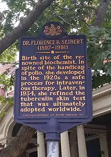 |CitationClass=تم تجاهله (مساعدة) - "Search Tips advanced search magbottom Dr. Florence Seibert Historical Marker". Explore PA History. مؤرشف من الأصل في 2 يناير 2019. اطلع عليه بتاريخ 26 أكتوبر 2015. الوسيط