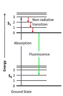 عندما يمتص أحد إلكترونات ذرة المادة فوتونا (شعاع ضوء) ذو طاقة عالية من المصدر، يـُثار الإلكترون ويرفع إلى مستوى طاقة أعلى في الذرة s1 , ويهتز. ثم يهدأ اهتزاز الإلكترون في الذرة نازلا إلى مستوى طاقة أسفل منه مرسلا ضوءا مميزا للمادة ذو طول موجة أطول من طول موجة الشعاع الساقط (الشعاع الأخضر في الرسم). تعتمد طول موجة الشعاع الصادر من الذرة على مستويات الطاقة التي ينتقل بينها الإلكترون في الذرة (انظر الشكل) . فقد يكون التوهج اللاحق للإصار ذو لون احمر أو أخضر أو غير ذلك حسب نوع المادة.