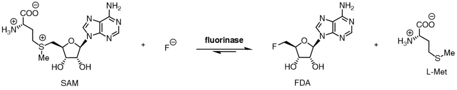 تفاعل أيون الفلوريد مع S-أدينوسيل الميثيونين بأثر تحفيزي من إنزيم فلوريناز.