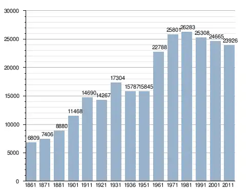 في سنة 1861 بلغ عدد السكان 6٬809 نسمة، وتطور العدد ليصل في سنة 2011 لـ 23٬926 نسمة.
