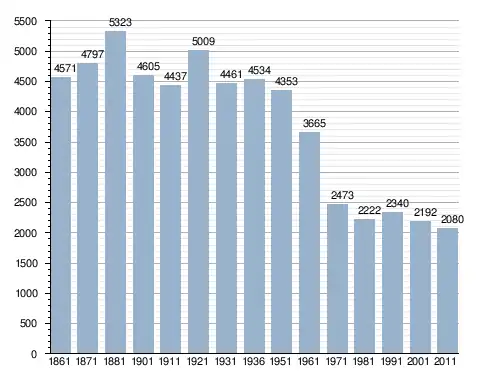 في سنة 1861 بلغ عدد السكان 4٬571 نسمة، وتطور العدد ليصل في سنة 2011 لـ 2٬080 نسمة.