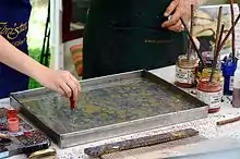 عادة ما يتم استخدام حوض مستطيل الشكل مصنوع من الزنك له حواف ملساء تمكن من سحب الورقة دون خدوش يتم وضع الماء والخليط فيه [هل المصدر موثوق؟]