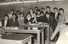 فهد سالم الشكرة في وسط الصورة الوحيد الذي يرتدي نظارات