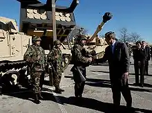 جورج بوش يلتقي جندي من الجيش الأميركي خلال زيارة إلى قاعدة فورت هود. (2003)