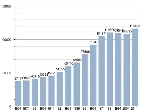 في سنة 1861 بلغ عدد السكان 37٬477 نسمة، وتطور العدد ليصل في سنة 2011 لـ 116٬434 نسمة.