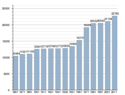 في سنة 1861 بلغ عدد السكان 10٬484 نسمة، وتطور العدد ليصل في سنة 2011 لـ 22٬785 نسمة.
