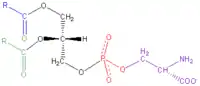 أزرق، أخضر: مجموعات أحماض دهنية متغيرة الأسود: جليسرول الأحمر: فوسفات البنفسجي: سيرين | |