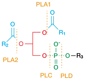 أماكن الفصم التي تحفزها إنزيمات فوسفوليباز المختلفة. يقوم فوسفوليباز C بقطع (فصم) الرابطة عند مجموعة الفوسفات المرتبطة بمجموعة R3.