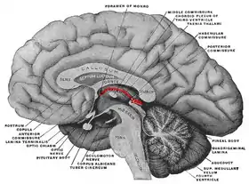 ![]() جانب وسطي من دماغ مأخوذ منه مقطع في مستوى السهمي الناصف. يشار لفوق المهاد باللون الأحمر، بوساطة المقرن العناني (العنان هو تركيب تشريحي يشبه لجام الفرس) والجسم الصنوبري والمقرن الخلفي ببروزه باتجاه الأمام مشكلا السطور النخاعية. | |