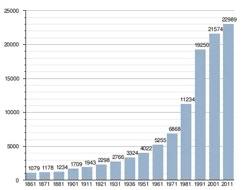 في سنة 1861 بلغ عدد السكان 1٬079 نسمة، وتطور العدد ليصل في سنة 2011 لـ 22٬989 نسمة.