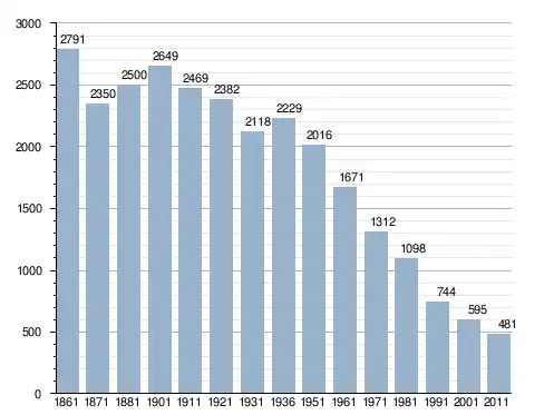 في سنة 1861 بلغ عدد السكان 2٬791 نسمة، وتطور العدد ليصل في سنة 2011 لـ 481 نسمة.