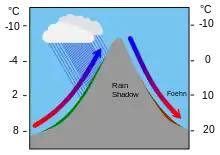 كما يظهر الرسم التوضيحي؛ تهب الرياح على سفح الجبل المواجه لها وبفعل اصطدامها بالسفح يتغير اتجاه مسيرها لتتجه للقمة. عند ارتفاعها تقل درجة حرارتها، بانخفاض حرارة الهواء في الطبقات العليا يصل الهواء إلى درجة التكاثف، وتهطل الأمطار على هذه الجهة المواجهة من الجبل، وعندما تتجاوز الرياح القمة وتبدأ - بفعل تغير كثافة الهواء بفعل البرودة - بالهبوط على السفح الآخر للجبل، فإنها ترتفع درجة حراتها بفعل الاحتكاك الشديد بالجبل، وتنخفض نسبة الرطوبة فيها لتصير رياحاً جافةً دافئة.