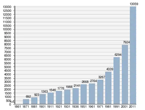 في سنة 1871 بلغ عدد السكان 692 نسمة، وتطور العدد ليصل في سنة 2011 لـ 13٬059 نسمة.