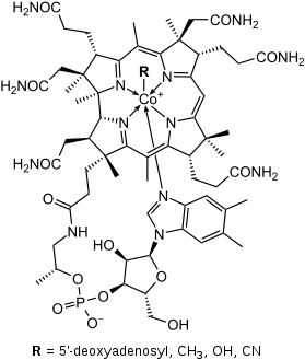 فيتامين ب 12 هو الأكثر تعقيدًا كيميائيًا من جميع الفيتامينات. ويستند هيكل فيتامين ب 12 على حلقة كورين، التي تشبه حلقة البورفيرين الموجودة في الهيم، الكلوروفيل، والسيتوكروم. أيون المعدن المركزي هو الكوبالت. يتم توفير أربعة من مواقع التنسيق الستة من قبل حلقة الكورين، والخامس من قبل مجموعة dimethylbenzimidazole. موقع التنسيق السادس، مركز التفاعل، متغير، كونه مجموعة سيانايد(–CN)، مجموعة هيدروكسيل (–OH)، مجموعة ميثيل (–CH3) أو مجموعة أدينوزين منزوعة الاوكسجين من الموقع الخامس (هنا ذرة C5 ′ من deoxyribose تشكل الرابطة التساهمية مع الكوبالت)، على التوالي، لإعطاء النماذج الأربعة فيتامين ب 12 المذكورة أدناه. من الناحية التاريخية، تعتبر الرابطة التساهمية C-Co أحد الأمثلة الأولى على روابط الكربون المعدني التي تم اكتشافها في علم الأحياء. هيدروجيناز، وبالضرورة، الأنزيمات المرتبطة باستخدام الكوبالت، تشمل على روابط معدنية كربونية.[43]