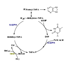 - MTR ، والمعروف أيضا باسم مصنع الميثيونين، هو إنزيم ناقل الميثيل، والذي يستخدم MeB12 ونوع التفاعل الثاني لنقل مجموعة الميثيل من 5-methyltetrahydrofolate إلى homocysteine ،وبهذه الطريقة يتم إنتاج tetrahydrofolate و ميثيونين[28] هذه الوظيفة مفقودة في نقص فيتامين ب 12 ، مما يؤدي إلى زيادة مستوى ال homocysteine وحبس الfolate ك 5-methyltetrahydrofolate ، والتي لا يمكن استردادها من THF (الشكل النشط للحمض الفوليك). يلعب THF دورًا مهمًا في بناء الحمض النووي (DNA) لذا فإن انخفاض وجود الـ THF يؤدي إلى إنتاج غير فعال للخلايا التي لها معدل دوران سريع، خاصةً خلايا الدم الحمراء، وكذلك خلايا جدار الامعاء المسؤولة عن الامتصاص. يمكن إعادة بناء THF عبر MTR أو يمكن الحصول عليها من حمض الفوليك الطازج في النظام الغذائي. وهكذا، فإن جميع التأثيرات الاصطناعية للحمض النووي لنقص فيتامين ب 12 ، بما في ذلك فقر الدم الضخم الأرومات من فقر الدم الخبيث ، تحل إذا كان هناك ما يكفي من حمض الفوليك موجود في الغذاء. وبالتالي، فإن أفضل "وظيفة" معروفة لـ فيتامين ب 12 (التي تشارك في بناء الحمض النووي، وانقسام الخلية، وفقر الدم) هي في الواقع وظيفة اختيارية تتم بوساطة فيتامين ب 12- الحفاظ على شكل نشط من حمض الفوليك وهو ضروري لإنتاج فعال للحمض النووي.[29] انزيمات methyltransferase أخرى والتي تتطلب ال cobalamin معروفة أيضا في البكتيريا مثل : Me-H4-MPT و coenzyme M methyltransferase.