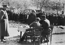 منذ منتصف الليل كانت الأسلحة على جميع الجبهات صامتة. بأمر من الجنرال كارل دونيتز، توقف الفيرماخت عن القتال اليائس. مع هذا، انتهى صراع بطولي دام ما يقرب من 6 سنوات. جلبت لنا انتصارات كبيرة ولكن أيضا هزائم ثقيلة. وقد هزم الفيرماخت بشرف من قبل قوى متفوقة. لقد بذل الجندي الألماني، وفقا لحلفه، جهدا لا ينسى لشعبه. حتى النهاية، دعم الوطن بكل قوته، تحت أشد التضحيات. يجب أن يحظى الأداء الفردي للجبهة بشرفها النهائي في الحكم العادل اللاحق. إنجازات وتضحيات الجنود الألمان في البحر، على الأرض وفي الجو لم تفلت من إشعار عدونا. لذلك، يمكن لكل جندي أن يرفع رأسه عالياً، ويضع سلاحه بفخر. يمكنه أن يبدأ العمل بشجاعة وثقة في أقسى ساعة في تاريخنا، من أجل الحياة الأبدية لشعبنا.