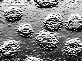 ![]() صورة بالمجهر الإلكتروني لفيروس الأورام الحليمية | |