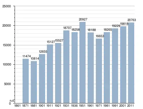 في سنة 1871 بلغ عدد السكان 11٬474 نسمة، وتطور العدد ليصل في سنة 2011 لـ 20٬763 نسمة.