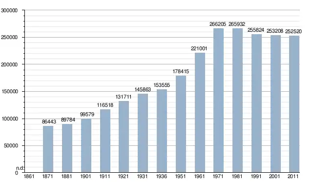 في سنة 1871 بلغ عدد السكان 86٬443 نسمة، وتطور العدد ليصل في سنة 2011 لـ 252٬520 نسمة.
