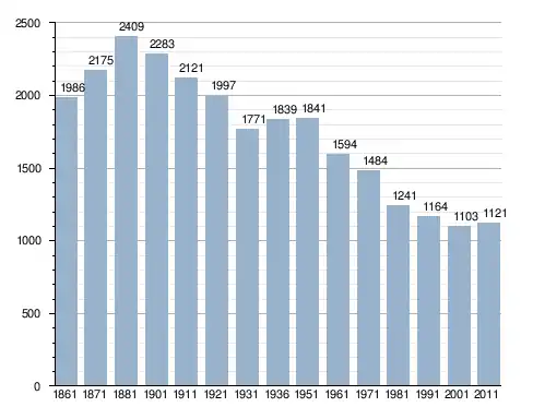 في سنة 1861 بلغ عدد السكان 1٬986 نسمة، وتطور العدد ليصل في سنة 2011 لـ 1٬121 نسمة.