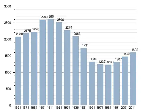 في سنة 1861 بلغ عدد السكان 2٬080 نسمة، وتطور العدد ليصل في سنة 2011 لـ 1٬602 نسمة.