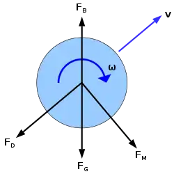 - قوة ماغنوس (FM) الناتجة عن دوران الكرة،
