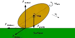 عند اصطدام جسم الكرة بالأرض، يتحول جزء من الطاقة الحركية للجسم إلى طاقة حركة دورانية تحدد قيمتها واتجاه دورانها وفقا لزاوية سقوط الكرة وسرعتها الزاوية. في حالة تحرك الكرة أفقيا عند الإصطدام، فسوف تتعرض لقوى احتكاك تؤثر في الاتجاه المعاكس لحركة الكرة. في الشكل المقابل، تتحرك الكرة في اتجاه اليمين وبالتالي يكون اتجاه تأثير قوى الاحتكاك في اليسار. أما في حالة دوران الكرة عند الاصطدام، فسيكون للاحتكاك رد فعل دوراني في الاتجاه المعاكس لدوران الكرة. يظهر في الشكل المقابل، دوران الكرة في اتجاه عقارب الساعة وتتحرك النقطة التي اصطدمت بالأرض نحو اليسار بينما تؤثى القوى الدورانية المعاكسه في اتجاه اليمين. على عكس القوة العمودية وقوة الجاذبية، تؤثر القوى الاحتكاكية على عزم دوران على الكرة وتغيير سرعتها الزاوية (ω).[28][29][30][31] عند سقوط الكرة يمكن أن تنشأ ثلاث حالات وهم:[31][32][33]