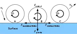 - إذا دفعت الكرة للأمام مع دوران علوي، فإن كلا من قوى الاحتكاك السطحي وقوى الدوران سيعملان في اتجاهين متعاكسين. يعتمد ما سيحدث على أين من القوتين ستهيمن.