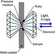 إن خلية سندان الماس هي جهاز موضوع على منضدة لتركيز الضغط. ويمكنه ضغط قطعة صغيرة (يبلغ حجمها بضعة ميلليمترات) من المواد إلى الضغط الشديد، الذي يمكن أن يتجاوز 3000000 غلاف جوي (300 جيجا باسكال).[7] وهذه الضغوط تتجاوز الضغوط الموجودة في مركز الأرض. ويكون تركيز الضغط على حافة الماس ممكنًا بسبب صلابته، في حين أن الشفافية وارتفاع الموصلية الحرارية تتيح مجموعة من التحقيقات التي يمكن استخدامها لفحص حالة العينة. ويمكن تسخين العينة حتى آلاف الدرجات المئوية.