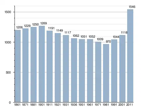 في سنة 1861 بلغ عدد السكان 1٬206 نسمة، وتطور العدد ليصل في سنة 2011 لـ 1٬546 نسمة.