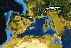 التفسير الفني لفيضان البحر الأبيض المتوسط عبر مضيق جبل طارق (A) ومضيق صقلية (F) منذ حوالي 5.3 مليون سنة.