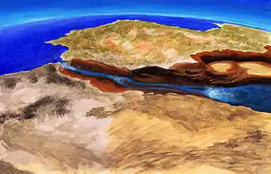 التفسير الفني لفيضان البحر الأبيض المتوسط عبر مضيق جبل طارق؛ المنظر في هذه الصورة من الجنوب الغربي من هذا المضيق، مع الجزر البريطانية المستقبلية في الزاوية اليسرى العليا.