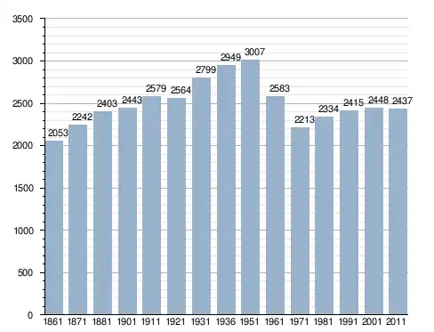في سنة 1861 بلغ عدد السكان 2٬053 نسمة، وتطور العدد ليصل في سنة 2011 لـ 2٬437 نسمة.