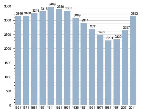 في سنة 1861 بلغ عدد السكان 3٬146 نسمة، وتطور العدد ليصل في سنة 2011 لـ 3٬153 نسمة.
