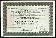 تأسست شركة فيليبس في عام 1891 على يد جيرارد فيليبس ووالده فريدريك فيليبس. فريدريك ، مصرفي مقيم في زالتبوميل ، قام بتمويل شراء وإنشاء مبنى مصنع فارغ في أيندهوفن ، حيث بدأت الشركة في إنتاج مصابيح من خيوط الكربون وغيرها من المنتجات الكهربائية التقنية في عام 1892. تم تعديل هذا المصنع الأول منذ ذلك الحين ويستخدم كمتحف.[8]